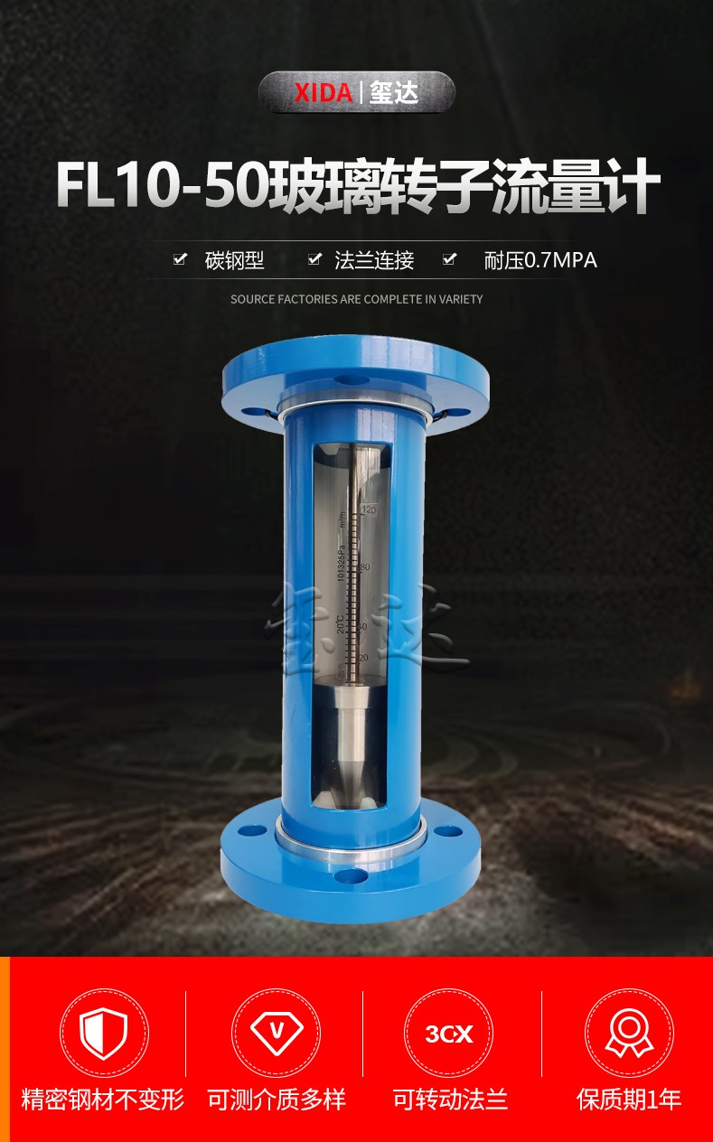 璽達FL10-50法蘭玻璃轉子流量計是一款市場通用,垂直安裝,可測量氣體or液體的瞬間流量計。