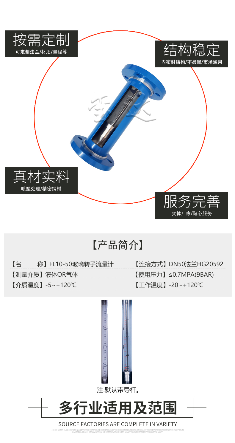 5. 延伸:FL10-50法蘭玻璃轉子流量計是一款可測普通介質的流量計。如需耐腐型流量計,可選擇耐腐玻璃管轉子流量計或不銹鋼玻璃管浮子流量計或PTFE玻璃管轉子流量計。連接方式還有其它選擇:螺紋連接,軟管連接,卡盤連接。
